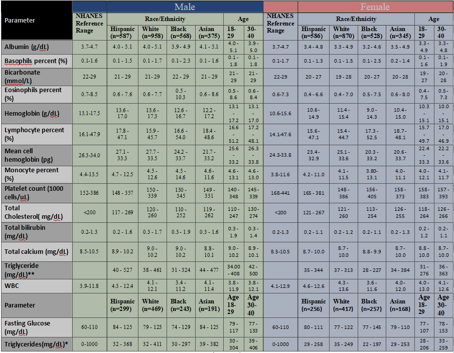 · Lymphocyte (%): Observed ranges differed from NHANES values, particularly among females across racial groups.