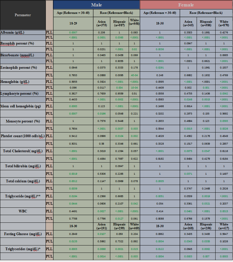 Table 2: Quantile regression P-value for Normal Ranges of Clinical Laboratory Tests for significance of race and age group by Sex