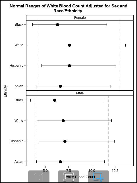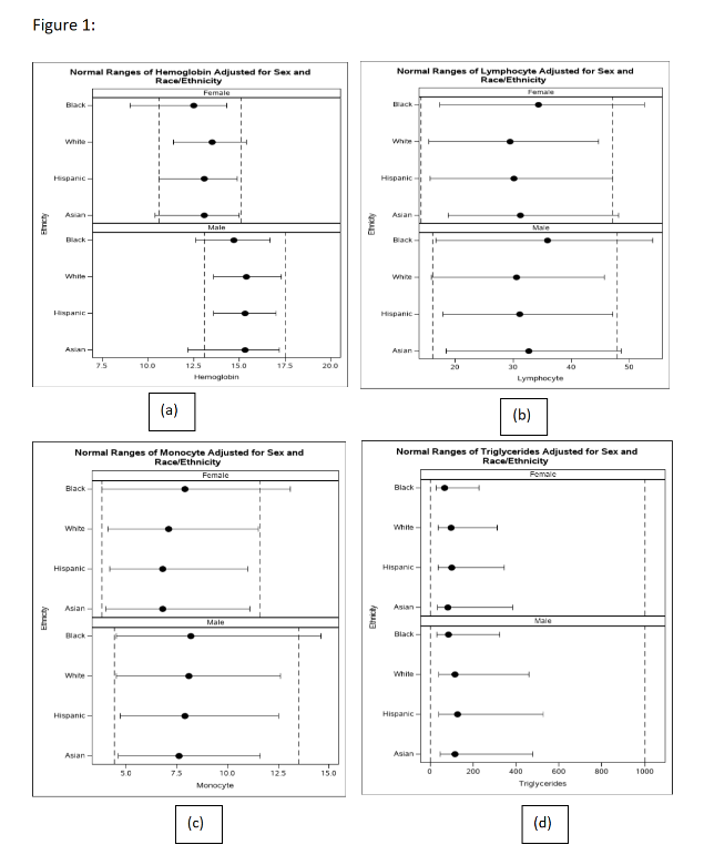 Figure 1 illustrates variations in normal ranges for selected laboratory tests by sex and race/ethnicity: